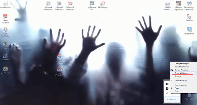 1. Setelah Menginstal wallpaper engine, buka wallpaper engine nya dengan cara mencari programnya di taskbar atau mudahnya dengan mencari ikonnya di panel pojok kanan bawah taskbar kalian, klik kanan pada ikonnya lalu pilih Create Wallpaper seperti yang terlihat pada gambar